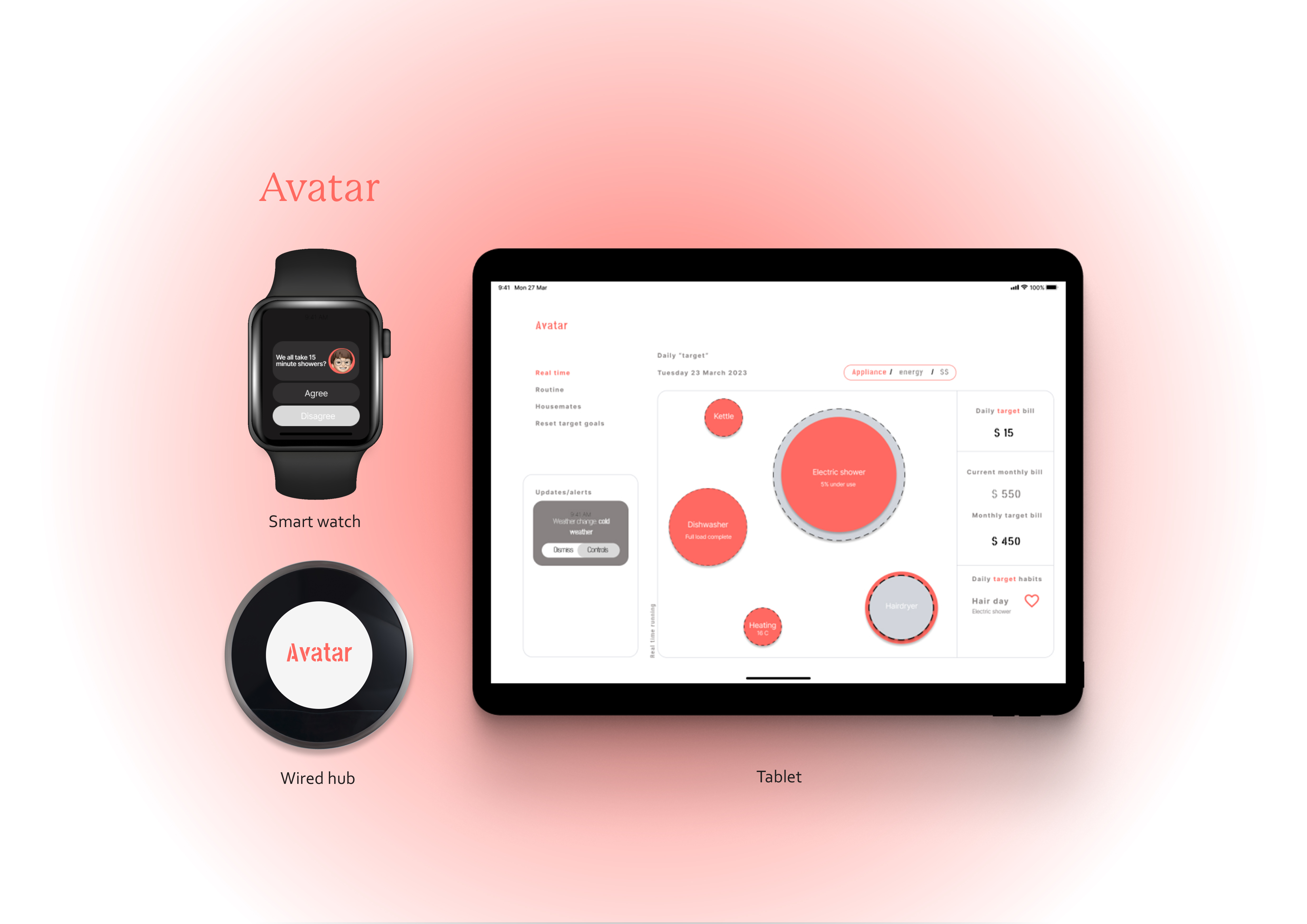 Collaborate with other household dwellers to work towards a common goal. The big interface stays stationary to the home, whilst the digital watch interface allows freedom to monitor, communicate and control energy consumption 'on the go'.