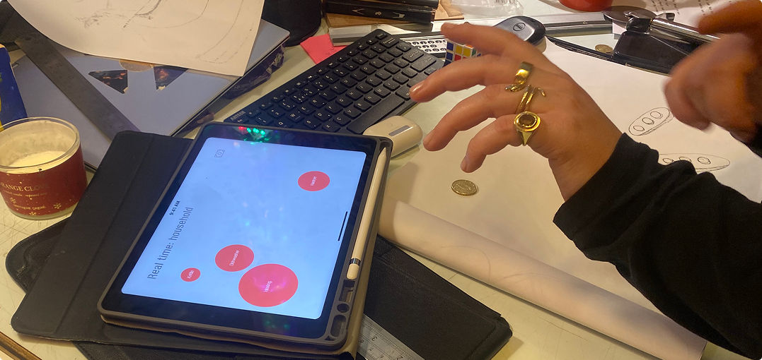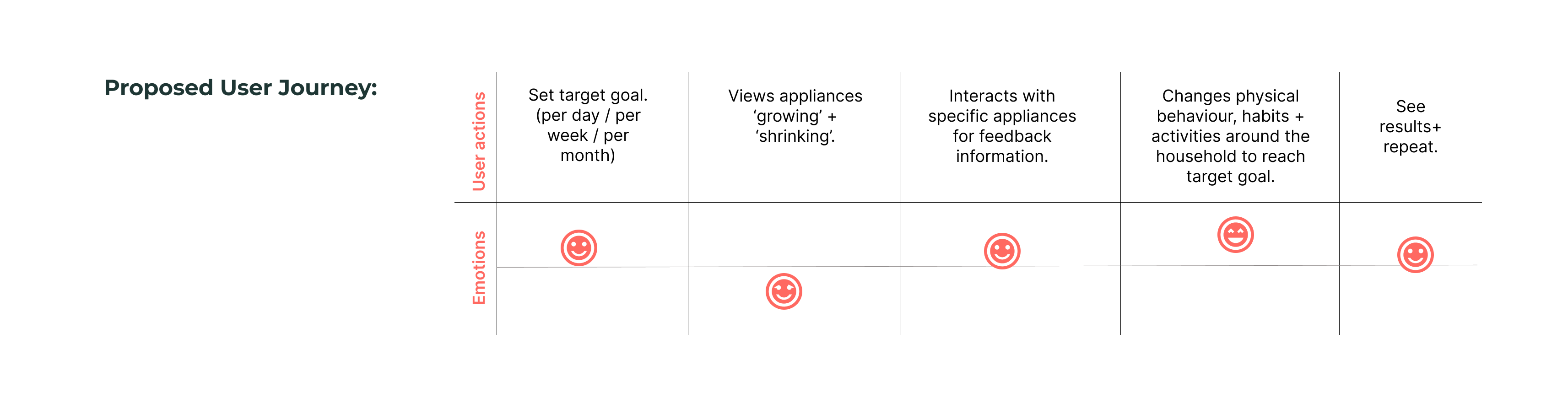 Application user flow: Set target energy spending goal (day / month / year), view appliances in real time on the interactive screen (the circles represent appliances and they grow and expand or shrink depending on their usage). The user can interact with a selected appliance (circle on the screen) and receive feedback on its status. The user can then adapt to the feedback through guided changed behaviour, creating more economical and better habits. This is reinforced with a report for the user to view results and repeat.